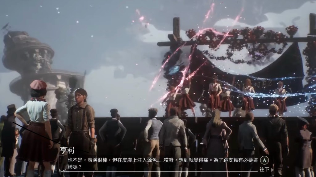 例如,我們會在城市街頭看見正在煩惱報紙頭版標題的記者,也會看到群眾們正在觀賞表演。這些過程都極短、極日常,卻在無形中揭示了整個社會如何與「抹煞」這件事共存。而更厲害的是——這些對話沒有單一立場。你會遇到支持遠征的人,也會聽到質疑遠征的人。甚至有人乾脆選擇逃避,轉身投入酒精或享樂,因為反正之後就輪到自己。